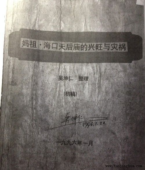 在吴坤仁分别于1996年1月整理的《海口天后庙的兴旺与灾祸》手抄本以及1996年9月写作的《浅谈海口天后庙与乱建庙祠》中,不仅总结了很多有关几百年来这座庙祠的风雨历程,还表达了吴坤仁对于天后宫迟迟未修缮的担忧与叹息。在《浅谈海口天后庙与乱建庙祠》中的一段,他就提到,1958年“大跃进”、“破封建迷信”时期,天后圣母木质神体被抛入长堤水中,庙中各式木质对联、匾横、石碑统统打碎;还有一段提到,该庙50多年没有修复,庙中木质建筑物已经腐朽,庙外顶上的建筑图案也已经倒塌……此外,吴坤仁在文中还多次表示希望天后宫能按照原样维修。